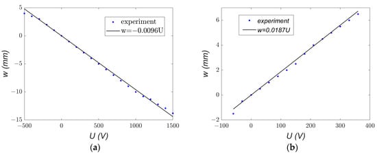 Analysis of Figure 4 and Figure 5 reveals that, for the same voltage polarity, the beams deform in opposite directions: under positive voltage, the beam with the P1 element deflects downward, whereas the beam with the P2 element moves upward. This difference is attributed to the distinct piezoelectric mechanisms associated with the d33 and d31 effects. Using Equation (4) and applying the least squares method to the measurement data, the values of the coupling coefficient α1 were determined for both elements. The natural frequency value ωo = 51.71 rad/s, taken from Figure 2b, was used in the calculations. Figure 6 illustrates the experimental relationship w = f(U) along with its linear approximation.