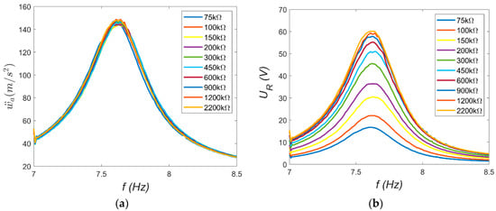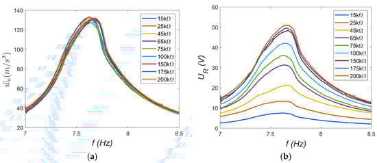 In TEST 2, the electrodynamic shaker and the harvester played key roles. The shaker generated a kinematic excitation with constant acceleration amplitude as = 0.4 g, while the frequency f was swept slowly and linearly from 7 Hz to 8.5 Hz. The harvester consisted of a combination of resistors used to vary the load resistance R of the electrical circuit. A series of measurements was conducted with different load resistances: from 75 kΩ to 2200 kΩ for MFC-P1 and from 15 kΩ to 200 kΩ for MFC-P2. The resonance characteristics of the absolute vibration amplitude at the beam tip ẅa and the voltage across the resistor UR were recorded using the Scadas Mobile analyzer. The resulting characteristics are shown in Figure 7 and Figure 8.