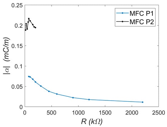 Next, the electromechanical coupling coefficient α was determined from Equation (9). Calculations were performed using maximum amplitude values at ω = ωr = 47.91 rad/s. The necessary relative vibration amplitudes ẅo were obtained from Equation (12). The resulting acceleration amplitudes were: 143.88 ms−2 (corresponding to displacement amplitude wo = 0.0627 m) for MFC-P1 and 127.58 ms−2 (displacement amplitude 0.0556 m) for MFC-P2. These displacement amplitudes correspond to approximately 20% of the beam length: 0.0627/0.316 = 0.198 for P1 and 0.0556/0.316 = 0.176 for P2. Such values indicate that large-amplitude beam vibrations were analyzed in this case. The capacitance C of the piezoelectric elements, needed for calculations, was measured using the AX-18B Axiomet multimeter as 7.14 nF for MFC-P1 and 185.64 nF for MFC-P2. Using Equation (9), the dependence α = f(R) was derived and is presented in Figure 9.
