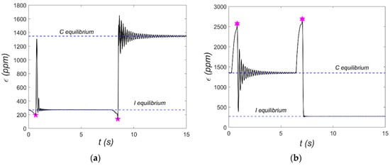 The strain gauge mentioned earlier was used to measure the shell’s dynamic response—specifically, the strain ε at a single location. Figure 11 includes horizontal dashed lines indicating the strain gauge readings corresponding to the two stable equilibria: for example, ε = 1350 ppm in the C-equilibrium state. It is important to refer to the manufacturer’s data [7], which specifies the following: