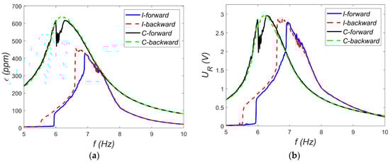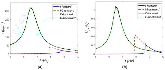 Several observations can be made based on the resonance characteristics. First, the beam’s resonance frequency ωr can be estimated from the frequency corresponding to the maximum amplitude, which was assumed to be ωr = 47.91 rad/s. This value is approximately 8% lower than the natural frequency ωo. This indicates that certain nonlinearities occur at large vibrations. This suggests a weak softening phenomenon. Second, the vibration characteristics of both beams should be nearly identical. However, slight differences visible in Figure 7a and Figure 8a may be attributed to structural differences between the MFC-P1 and MFC-P2 patches, as well as minor variations in the amount of adhesive applied during patch bonding. These factors likely caused the observed small discrepancies in resonance behavior. Furthermore, the load resistance does not significantly affect the beam’s mechanical response; the vibration amplitude curves nearly overlap. This suggests that the electrical load resistance has a negligible influence on the mechanical subsystem dynamics [14]. Lastly, the voltage UR across the resistor depends on the load resistance. For the same beam vibration amplitude, higher load resistances produce larger voltage outputs.
