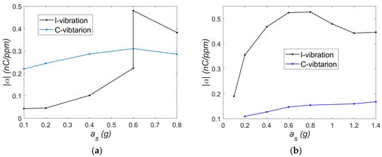 Electromechanical coupling coefficient α as a function of excitation amplitude as for (a) f = 5.5 Hz and (b) f = 9.1 Hz.