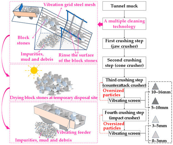 As shown in Figure 1, the production of RGAs consists of a cleaning stage and a crushing stage. Considering the cleanliness level of tunnel muck is usually low, the impurities, mud, and debris in RGAs will significantly worsen the adhesion performance of aggregates to asphalt. Therefore, it is necessary to deeply clean tunnel muck before crushing it. Before transporting tunnel muck from the excavation site to the temporary disposal site, it is roughly processed, and large debris such as tree branches are manually removed. Then, a multi-cleaning technology is adopted during the cleaning stage to further separate stone blocks from the impurities, mud, and debris mixed in the tunnel muck. The aim is to obtain clean stone blocks for the next crushing stage. Firstly, tunnel muck is subjected to a vibrating grid steel mesh to initially separate large-sized stones from impurities, mud, and debris. The mesh sizes should be flexibly selected according to the actual conditions of the tunnel muck delivered to the site. Subsequently, the residual impurities, mud, and debris on the surfaces of the stone blocks are cleared using a water-flushing device. Finally, the vibration effect applied by the vibrating feeder when feeding stone blocks in the crushing stage removes residual impurities, mud, and debris from the crushed stones again.