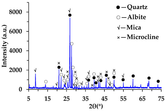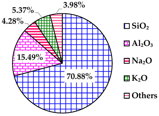 The XRD results of RGAs are presented in Figure 2. The diffraction pattern shows that there are many diffraction peaks of different intensities, indicating that the mineral types of RGAs are rich. Based on the matching degree of the main diffraction peaks, it is concluded that the main minerals in RGAs are quartz, mica (muscovite and biotite), albite, and microcline. According to the form of elemental oxides, these minerals are mainly composed of SiO2, Al2O3, Na2O and K2O, which is consistent with the analysis results of XRF. As shown in Figure 3, the total content of the four main chemical components exceeds 96%, with SiO2 alone reaching 70.88%. Groome and Hall proposed distinguishing the acidity or alkalinity of rocks based on the content of SiO2 [28]. Rocks containing over 65% of SiO2 are classified as acidic rocks. It is evident that RGAs are acidic aggregates. The bonding performance between acidic aggregates and asphalt, which also exhibits weak acidity, is poor. Therefore, reducing this adverse effect of acidic aggregates is a key prerequisite for their utilization in asphalt mixtures.