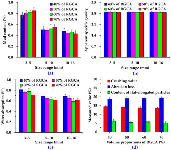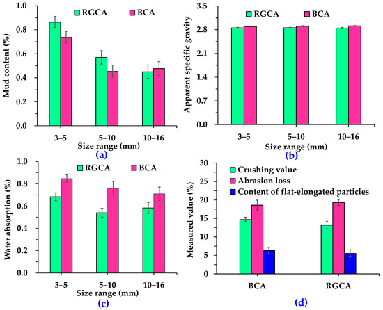 Comparison of conventional technical indexes between RGCA and BCA: (a) mud content; (b) apparent specific gravity; (c) water absorption; (d) crushing value, abrasion loss, and content of flat-elongated particles.