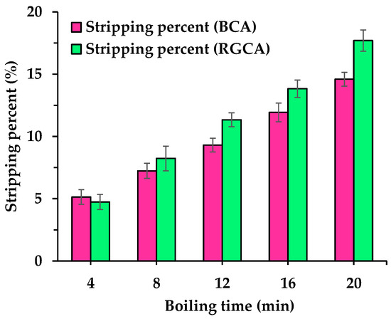 Test results of the bonding performance between coarse aggregates and SBS-modified asphalt under boiling water damage conditions are shown in Figure 5. It shows that the stripping percent of SBS-modified asphalt from the surfaces of RGCAs and BCAs gradually increases for both as boiling time extends. In terms of standard deviation, although the test results fluctuate within a certain range, they still exhibit a relatively obvious trend of change. In the early stage of water damage, the difference in asphalt-stripping percent between the two types of aggregates is small; however, as boiling time increases, that of RGCAs becomes higher. After 20 min of boiling-water damage, the asphalt-stripping percent corresponding to RGCAs and BCAs is 17.7% and 14.6%, respectively, with that of RGCAs being 21.2% higher than that of BCAs. This demonstrates that RGCAs impair the bonding performance between aggregates and asphalt, even when high-grade SBS-modified asphalt is used. Therefore, it is necessary to improve the bonding performance between RGAs and asphalt to facilitate its utilization in surface-layer asphalt mixtures.