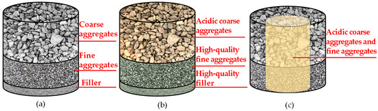 Aggregate composition of different asphalt mixtures: (a) asphalt mixture composed of conventional aggregates; (b) asphalt mixture containing acidic coarse aggregates; (c) asphalt mixture containing both acidic coarse and fine aggregates.