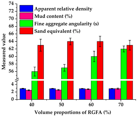 In terms of fine aggregates for surface-layer asphalt mixtures, the Chinese technical specifications require their apparent specific gravity, angularity, and sand equivalent to be more than 2.50, 30 s, and 60%, respectively, while the mud content should not exceed 3% [29]. Figure 8 shows that the main technical indexes of hybrid fine aggregates with RGFA volume proportions of 40%, 50%, 60%, and 70%, respectively, also meet the requirements of technical specifications [29]. In detail, the apparent specific gravity is 2.889–2.911, the mud content is 2.47–2.87%, the angularity is 56–62%, and the sand equivalent is 63–64%. The angularity of hybrid fine aggregates increases significantly with the increase in RGFA volume proportion. This is likely due to RGFAs altering the interlocking skeleton and contact states of particles in the hybrid fine aggregates.