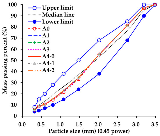 The suitable volume proportion of coarse aggregates with size ranges of 10–16 mm, 5–10 mm, and 3–5 mm, including fine aggregate (0–3 mm) and filler, was determined to be 20%, 26%, 18%, 32%, and 4%, respectively, based on the control group of A0 (pure basalt aggregate-based asphalt mixture). Aggregate types and volume proportions of each asphalt mixture are shown in Table 5, and the corresponding hybrid gradation curves are shown in Figure 9. As shown in Table 5, RGAs account for 40%, 50%, 60%, and 70% of the total aggregate volume in A1, A2, A3, and A4 (A4-0, A4-1, A4-2), respectively, and cement accounts for 25% and 50% of the total filler volume in A4-1 and A4-2, respectively. Figure 1 shows that, in the coordinate system with mass passing percent as the vertical axis, the hybrid gradations of these asphalt mixtures show little difference. This suggests that, although RGAs and basalt aggregates differ in density, the disparity is insufficient to markedly alter the hybrid gradations of asphalt mixtures. Furthermore, although cement and limestone powder exhibit notable differences in density, their limited dosage as fillers also exerts little effect on the hybrid gradations of asphalt mixtures. The design results of the volumetric properties of asphalt mixtures are presented in Table 6. This shows that all the main volumetric indexes of each asphalt mixture meet the design requirements. In detail, the number of voids in the mineral aggregates (VMAs) of asphalt mixtures incorporating RGAs is slightly larger than that of A0, indicating that RGAs have slightly altered the interlocking and stacking state of the aggregate skeleton. A higher VMA value means more asphalt is required to fill the gaps in the aggregate skeleton. Therefore, the optimum asphalt content (OAC) and voids filled with asphalt (VFA) of each asphalt mixture incorporating RGAs are also slightly larger than those of A0.