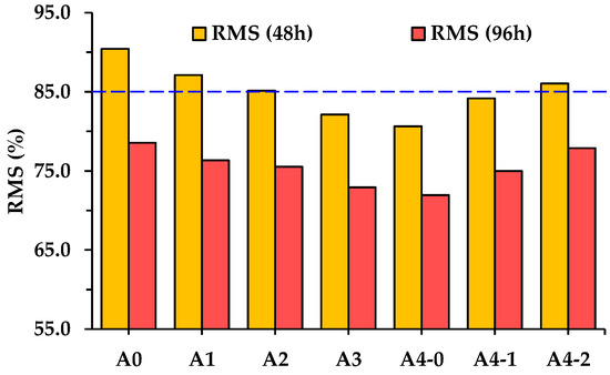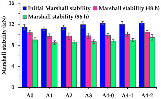Figure 11 shows that the Marshall stability of specimens after hot water damage is also sensitive to the RGA volume proportion, and as the proportion increases, the Marshall stability decreases more significantly. Specifically, after 48 h or 96 h of hot water damage, the Marshall stability of A4-0 always decreases the most, with the RMS being only 80.7% or 71.9%, respectively. The RMS begins to rise when cement is used as a partial filler. When the cement amount reaches 50% of the total filler volume, the RMS after 48 h and 96 h of hot water damage recovers to 86.1% and 77.9%, respectively. It proves that cement plays a positive role in improving the hot-water-damage resistance of asphalt mixtures incorporating acid aggregates. Even after long-term hot water damage, the RMS of A4-2 is equivalent to that of A0. In China, the RMS of asphalt mixtures prepared with modified asphalt is required to be no less than 85% after 48 h of hot water damage [29]. For asphalt mixtures with hybrid aggregates, the RMS of A1, A2, and A4-2 meets this requirement, while that of A2 is near the lower limit.