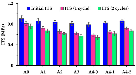 ITS values of asphalt mixtures before and after freeze–thaw damage.
