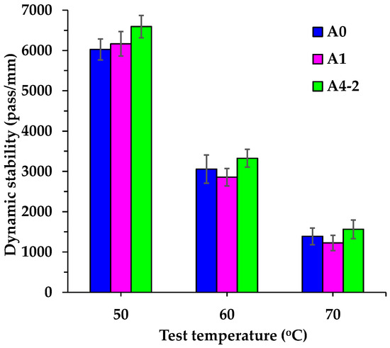 where DS is dynamic stability, pass/mm; s is the wheel speed, pass/min; (d2 − d1) is the increment of rutting depth from t1 to t2 during the stable deformation stage, mm. The single test lasts for 1 h, and (d2 − d1) is typically measured from the 45th to 60th minute.