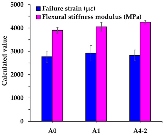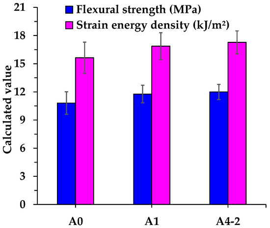 The failure strain, flexural strength, flexural stiffness modulus, and strain energy density of asphalt mixtures are shown in Figure 16 and Figure 17. As shown in the figures, the introduction of RGAs and cement leads to varying degrees of improvement in the failure strain, flexural strength, and flexural stiffness modulus of asphalt mixtures. Compared with the control group (A0), the failure strain, flexural strength, and stiffness modulus of A1 increase by 5.4%, 8.9%, and 4.0%, respectively. For A4-2, the corresponding values rise by 2.0%, 10.9%, and 9.1%. It indicates that RGAs and cement not only enhance the low-temperature deformation capacity and bearing capacity of asphalt mixture, but also increase its rigidity, thereby elevating the risk of brittle cracking.