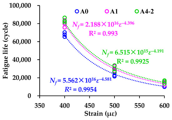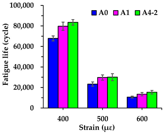 Figure 18 displays the fatigue life of each asphalt mixture measured under different initial strain levels. It is evident that the fatigue life of all asphalt mixtures is sensitive to strain levels. As strain increases, the fatigue life decreases gradually. Specifically, when the strain increases from 400 με to 500 με, the fatigue life of A0, A1 and A4-2 decreases by 65.6%, 62.8%, and 63.9%, respectively. When the strain further increases from 500 με to 600 με, the corresponding decreases are 54.3%, 54.6%, and 48.8%, respectively. Among the three asphalt mixtures, although the difference in fatigue life between A1 and A4-2 at 500 με is not significant, under the same test conditions, A4-2 consistently exhibits the highest fatigue life, followed by A1, with A0 being the lowest. Compared with A0, the fatigue life of A1 and A4-2 is 17.5% and 23.0% higher at 400 με, 27.4% and 29.2% higher at 500 με, and 26.6% and 44.8% higher at 600 με, respectively. It illustrates that RGA alone or the combination of RGA and cement plays a positive role in improving the fatigue life of asphalt mixtures, with the synergy of high-volume RGA and cement showing a more significant improvement at high strain.