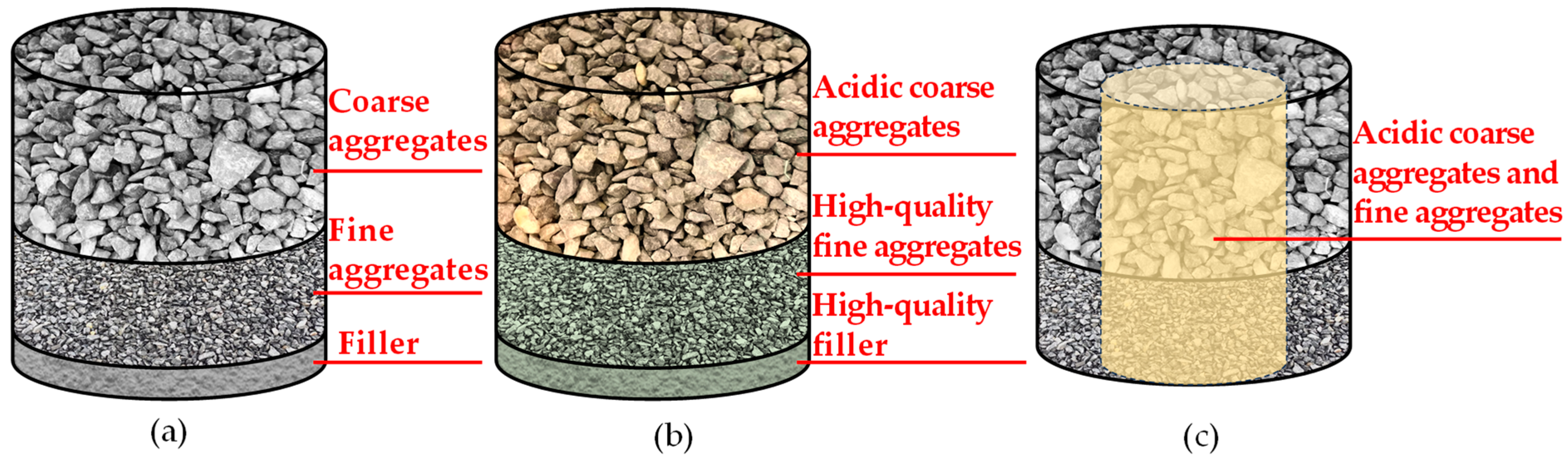 - Introducing a new method for simultaneously utilizing recycled granite coarse aggregates (RGCAs) and fine aggregates (RGFAs) to form hybrid aggregates with basalt, further analyzing the conventional technical properties of hybrid aggregates with varying RGA volume proportions, and then designing asphalt mixtures incorporating these hybrid aggregates. The pure basalt aggregate-based asphalt mixture served as the control group.