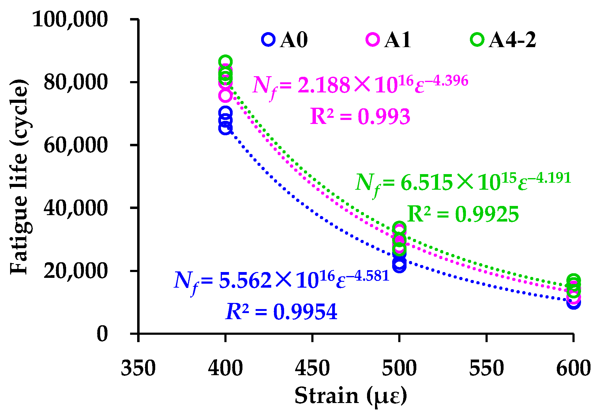 - Huang, W.; Zheng, M.; Huang, M. Fatigue Performance Comparison of Various Kinds of Asphalt Mixture. J. Build. Mater. 2015, 18, 1089–1094. [Google Scholar]