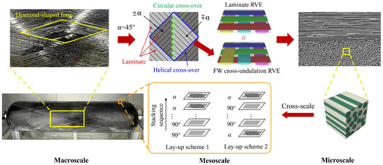 For the composite winding layers, the fiber bundle in-plane structure at the mesoscopic level resembles a cross-undulation RVE, as illustrated in Figure 10. However, the approximated laminate model may differ from this actual in-plane FW cross-undulation structure, necessitating further validation of the reliability of the widely used ply modeling for the FW composite layer. Moreover, the inter-layer structure may be regarded as laminate with various orientations, which can also be treated as a ply model and a homogenized model, as shown in Figure 10.
