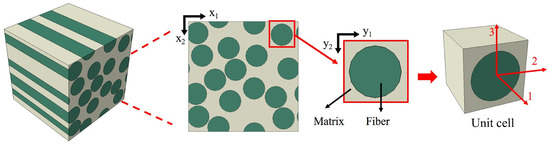 Composite structures are modeled as periodic arrangements of unit cells at the microscale. The position of any point is described by macroscopic coordinates and microscopic coordinates , illustrated in Figure 2, with a 7 μm diameter for the carbon fiber. The scaling parameter links these coordinate systems.