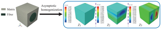 In Equation (11), the homogenization coefficient in the boundary force method is obtained by summing the volume-averaged stress and the volume-averaged elastic tensor within a unit cell. For CFRP materials consisting of carbon fibers and matrix, this coefficient includes two components: (1) the average elastic modulus of the structure and (2) the average additional stress induced by material heterogeneity in the unit cell. The asymptotic homogenization process can be efficiently implemented using commercial finite element software, as illustrated in Figure 3, where the characteristic function is the result of the displacement field for Equation (11) calculation.