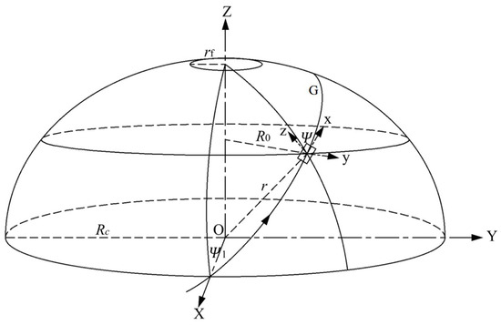 In geodesic theory, suppose G is the geodesic on the surface of the body of revolution, as shown in Figure 4. The spatial Cartesian coordinate systems O(x,y,z) and O(X,Y,Z) are established. The former is a static coordinate system and the latter is a dynamic coordinate system. On the surface of the body of revolution, the geodesic curve can be determined by the Clairaut relation [41].