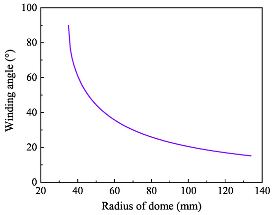 Not only are material properties complex in the design of composite layers, but the winding parameters are also variable. Helical winding and hoop winding can be realized on the tank cylinder, but hoop winding cannot be realized in the region of the dome. In this paper, the carbon fiber is T700SC-12K while the resin is 914 epoxy, and the producer-provided material parameters for fibers and the matrix are listed in Table 1. While the fiber volume fraction is 50%, the first-stage homogenized material properties in Table 2 at the micro level satisfy the requirement for input data, which can be applied to the meso-level laminate. By using the above theories with some initial data, shown in Table 3, the fibers’ distribution pattern at the dome can be obtained. The particularity of the dome structure determines the modeling complexity; the angle varies with the latitude circle’s radius, as shown in Figure 5, and the allowable pressure of the tank is 70 MPa. The change in winding angle near the pole hole is sharp, while that near the cylinder is gentle. The dome is divided into 14 regions according to the radius of the latitude circle, and the winding angle of each region is assumed to be constant. The purpose of segmentation is to facilitate modeling and to ensure reliability.