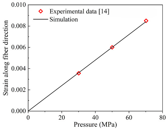 The element type of the tank model is C3D6, and the total number of elements is 122,360. This composite pressure vessel model is developed and meshed to study the mechanical behavior of the composite pressure vessel, which is the basis for evaluating the effectiveness of homogenization. In the elastic stage, the mechanical behavior of CFRP is similar, so the mesoscopic model of the composite pressure vessel is compared with the literature [14] to ensure the accuracy of the model. In order to verify it, the mode of alternate winding is determined, which is similar to that in the literature [14]. The foregoing hypothesis is validated in Figure 7, where the tested fiber-direction strain at different pressures agrees well with simulation results.