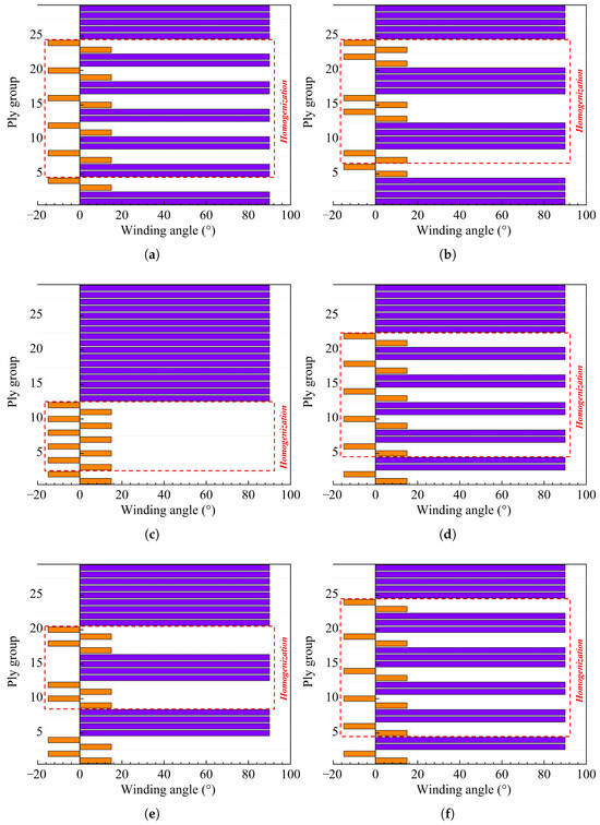 Lay-up design schemes. The orange color represents the hoop winding layer, and the purple color represents the helical winding layer. (a) Stacking sequence a, (b) stacking sequence b, (c) stacking sequence c, (d) stacking sequence d, (e) stacking sequence e, and (f) stacking sequence f.