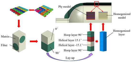 The homogenization method is widely used to simplify the analysis of composite structures based on rigorous mathematical derivation [20,21]. For the regions of interest, the most realistic modeling approach can be adopted, while for most of the other regions that are not of interest, the complexity and computational cost of the model can be greatly reduced by using homogenized material properties. The homogenization method can bridge the microscopic, mesoscopic, and macroscopic models and directly or indirectly study the mechanical properties [22,23,24] and damage mechanism [25,26,27] of composites through cross-scale analysis. The composite layers of pressure vessels are structurally similar to conventional laminates, which are stacked in a more complex way. Considering the homogenization method applied to the composite layer of the composite pressure vessel and studying the pressure performance of the model as a whole, the modeling of the tank can be simplified [28,29], and reliable analysis results can be obtained.