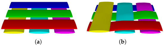 Morozov’s articles report extensive work on the effects of mosaic filament-winding patterns on the composite structure strength [42,43], and indeed, the winding pattern exerts a significant effect on the mechanical response of filament-winding structures [44]. In this work, we focus on in-plane FW cross-undulation structures to study the homogenization effect.