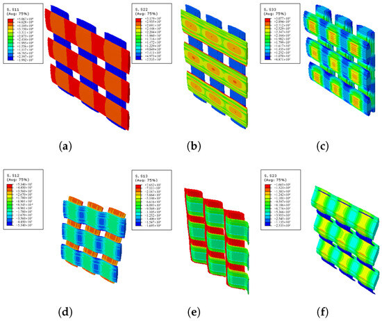 Stress field of laminate in-plane . (a) S11, (b) S22, (c) S33, (d) S12 and (e) S13, and (f) S23.