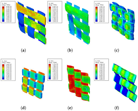Stress field of in-plane FW . (a) S11, (b) S22, (c) S33, (d) S12 and (e) S13, and (f) S23.