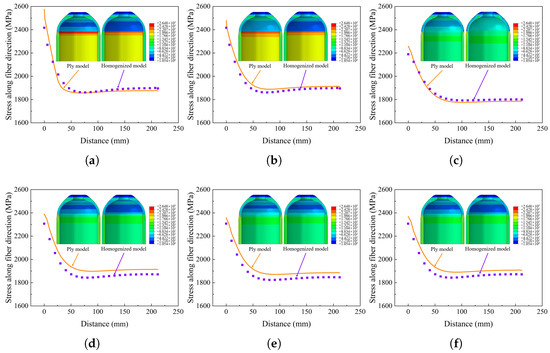 Homogenization theory does not need to consider the distribution characteristics of materials but focuses on the macroscopic integrity. The homogenization model can not only predict the maximum stress along the fiber well but also effectively reduce the modeling complexity. As the number of composite layers becomes larger, the improvement becomes more obvious.