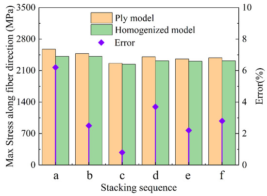 Max stress along the fiber direction and error. Homogenized model represents the partially homogenized model, and the horizontal axis represents the different stacking sequences, e.g., a represents stacking sequence a.