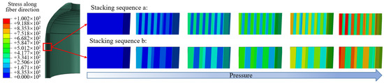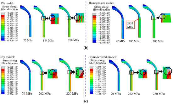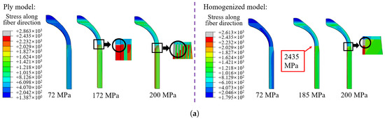The stacking sequence exerts a significant effect on the burst pressure. Numerical results of typical lay-up sequences a, b, and c indicate 172 MPa, 184 MPa, and 202 MPa burst pressure. This trend suggests that fewer alternating layers of hoop and helical winding result in higher burst pressure, which agrees well with the literature [16]. In order to analyze the burst pressure of the homogenized models, the maximum tensile stress criterion is used in this work. Furthermore, the validation of the homogenization method for predicting burst pressure under three different stacking sequences is discussed. The pressure on the inner surface of the liner is continuously increased to observe the minimum pressure that causes damage and damage expansion. Generally speaking, the internal pressure will increase in a small range from the appearance of damage to the rupture of the tank, but in practice, it is believed that the appearance of damage means the failure of the bearing performance of the tank. Therefore, the internal pressure at the time of damage can be regarded as the burst pressure. As shown in Figure 22, when the stress of the composite layer along the fiber direction is greater than the ultimate strength of the fiber, the deviation after homogenization of stacking sequence a is the largest, which is 7.56%. The burst pressure of the homogenization model of stacking sequence c is very close to that of the ply model. When the internal pressure increases, the damage expands along the thickness direction, and the hoop layers are destroyed before the helical layers. This result is consistent with the distribution of the maximum stress, indicating that the smaller the number of alternating layers of winding, the more accurate the homogenized model in predicting burst pressure.