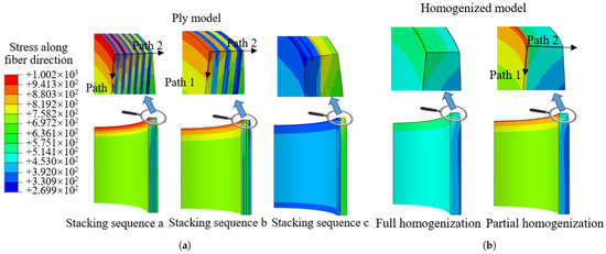 The stress along the fiber direction of the cylinder: (a) stacking sequences a, b, and c; (b) results of homogenization—full and partial—for stacking sequences a, b, and c.