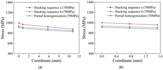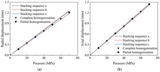The homogenization method can effectively characterize the overall properties of the composite layers, but the mechanical response of each layer cannot be characterized. For three different stacking sequences, namely, stacking sequence a, stacking sequence b and stacking sequence c, the radial displacement and axial displacement distributions of the tank at the internal pressure of 70 MPa are shown in Figure 21, and the displacement response of the homogenized model as a whole is accurate. Considering the stress distribution comprehensively, in theory, partial homogenization is more efficient than full homogenization.