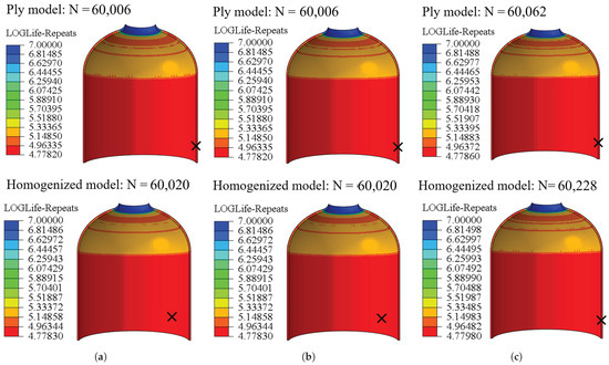 Comparison of fatigue life of three different stacking sequences, where N represents maximum number of loading cycles. (a) Stacking sequence a, (b) stacking sequence b, (c) stacking sequence c.