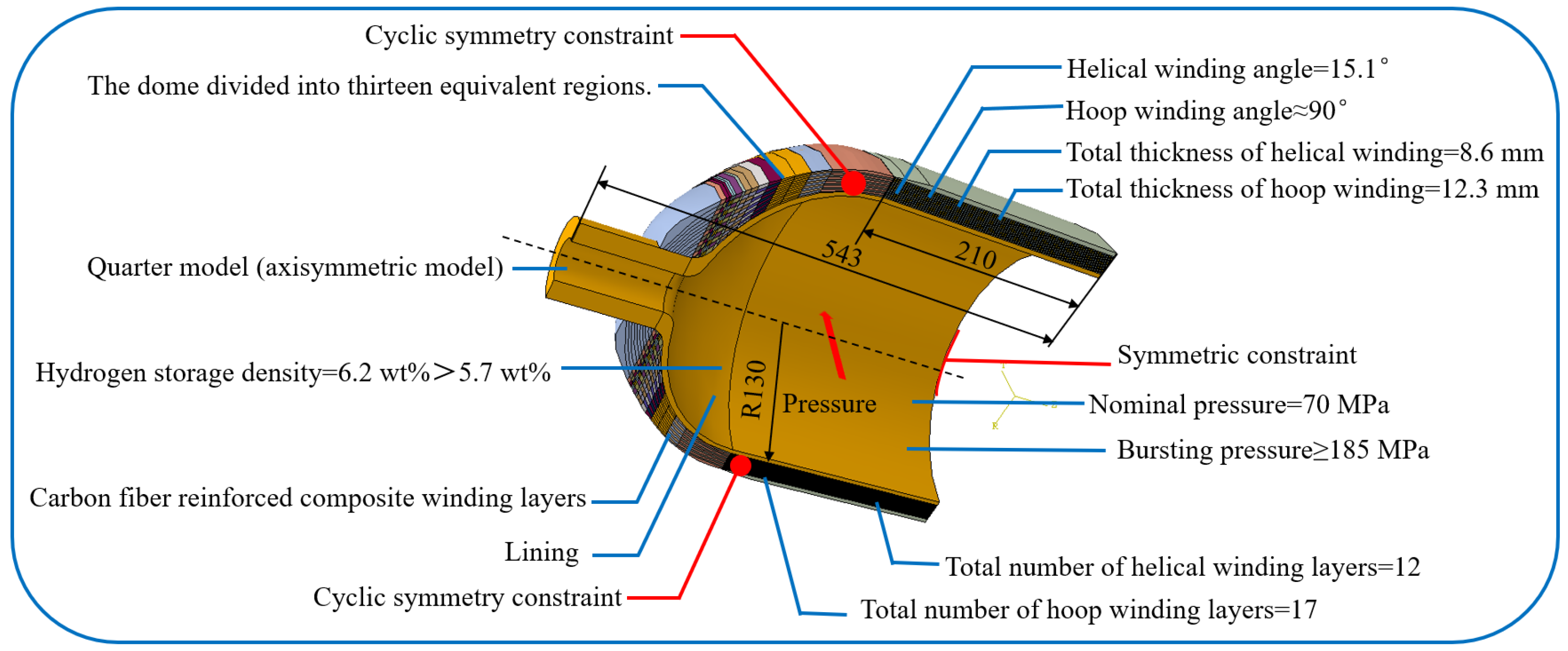 - Hu, Z.; Chen, M.; Zu, L.; Jia, X.; Shen, A.; Yang, Q.; Xu, K. Investigation on failure behaviors of 70 MPa Type IV carbon fiber overwound hydrogen storage vessels. Compos. Struct. 2021, 259, 113387. [Google Scholar] [CrossRef]