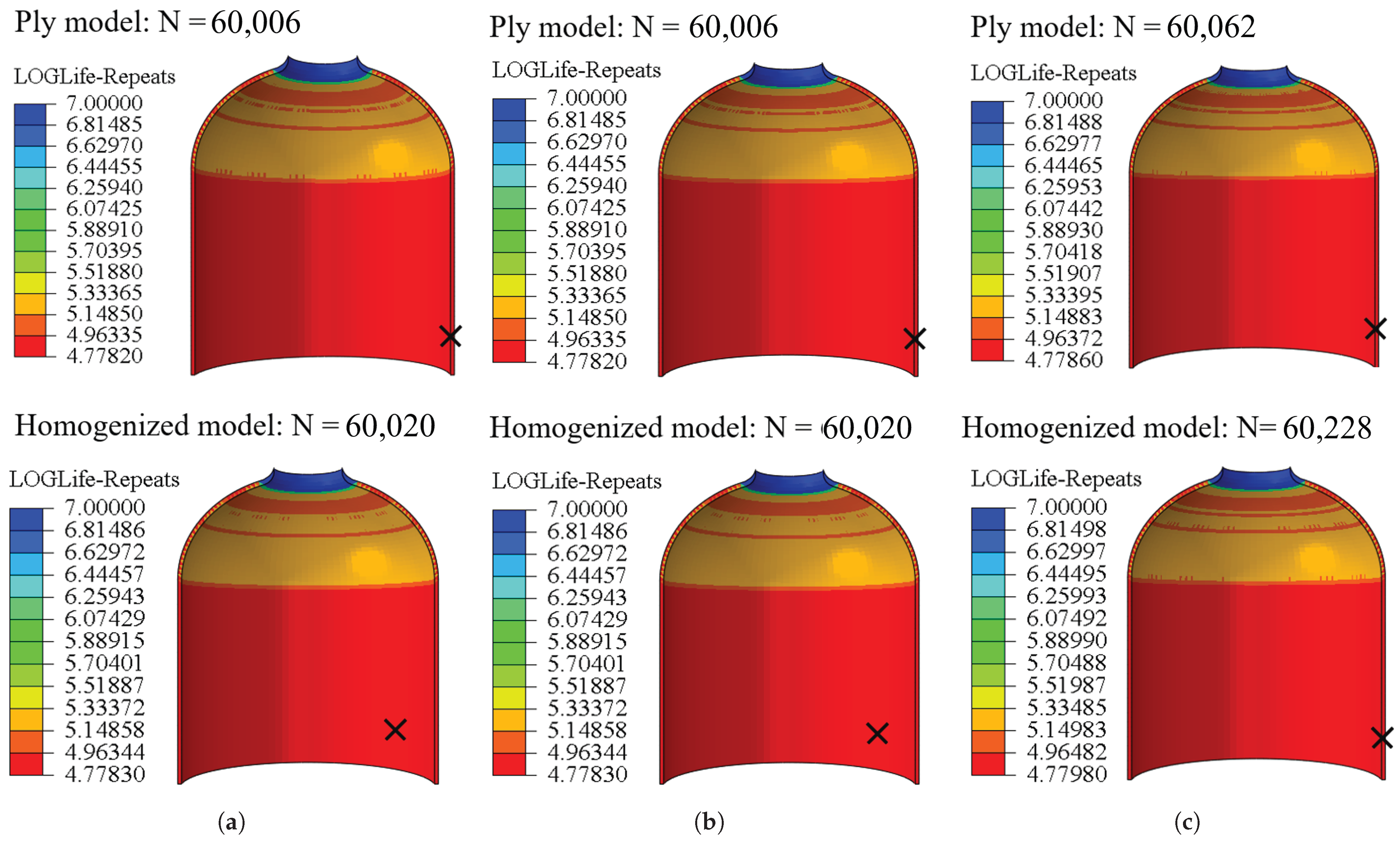 - By coupling ABAQUS® with FE-SAFE and incorporating an S-N curve for polyamide PA66, fatigue life analysis of the Type IV hydrogen composite tank liner is conducted. The results indicate that the fatigue cycles of the liner exhibit only 0.28% variation across different stacking sequences, demonstrating that homogenization has a negligible impact on lifecycle predictions.