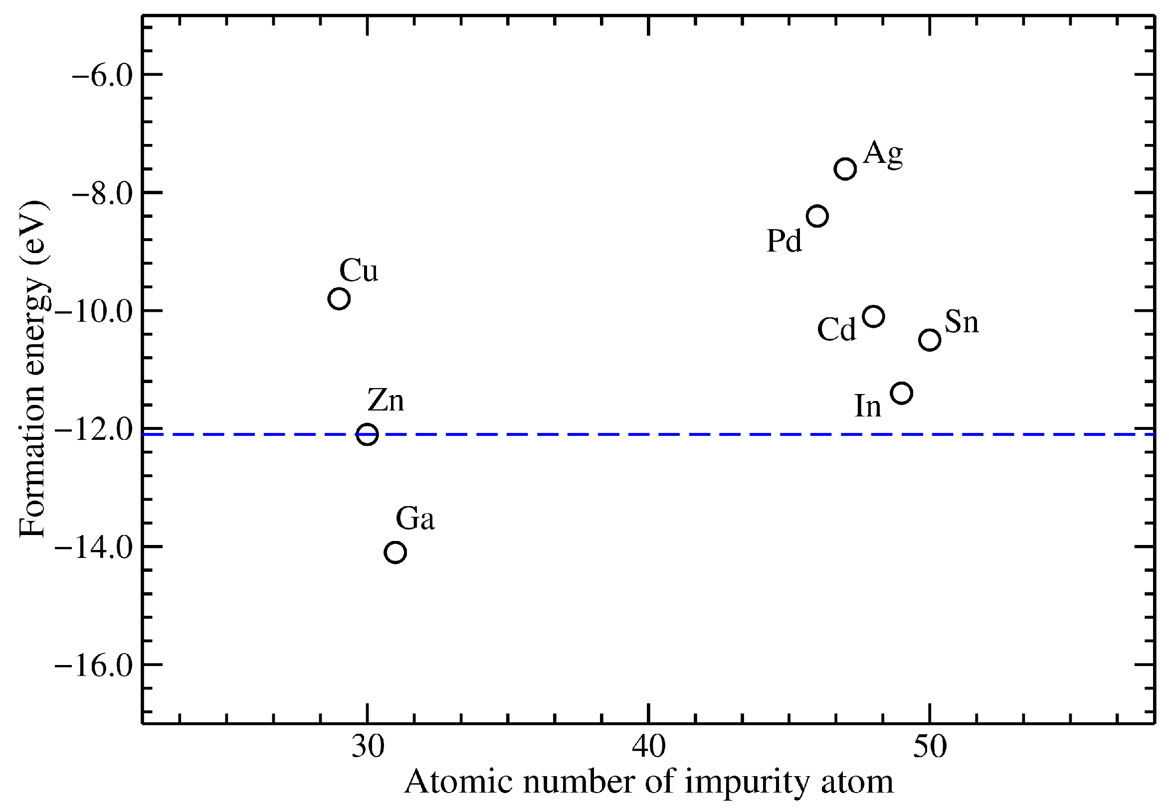 Figure 2. Formation energy as a function of the atomic number of the metallic impurity in ZnO. The horizontal dashed line corresponds to the pristine ZnO.