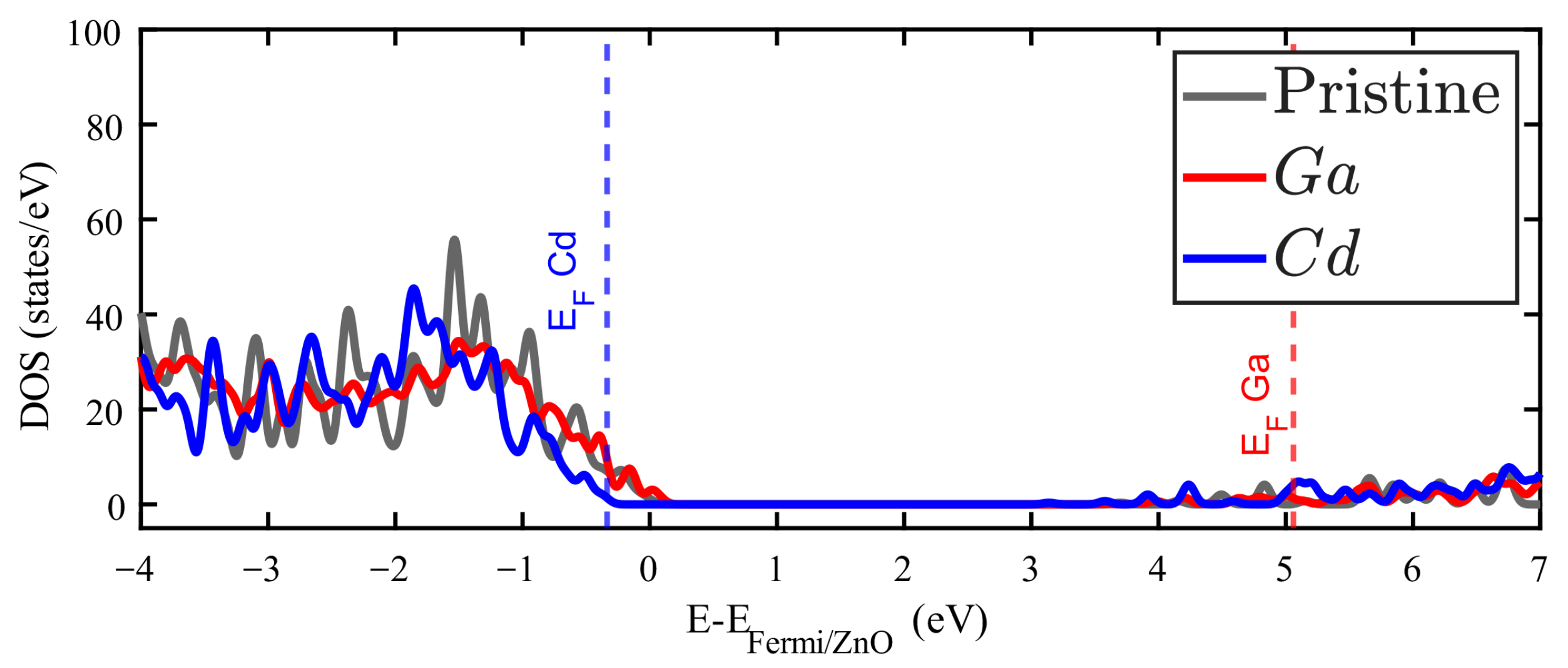 The densities of states (DOS) for doped ZnO are presented in the following figures. In each case, the DOS of pristine ZnO corresponds to the grey filled curve, setting to zero the Fermi level of this system. Vertical dashed lines are added to locate the Fermi level of each doped system.