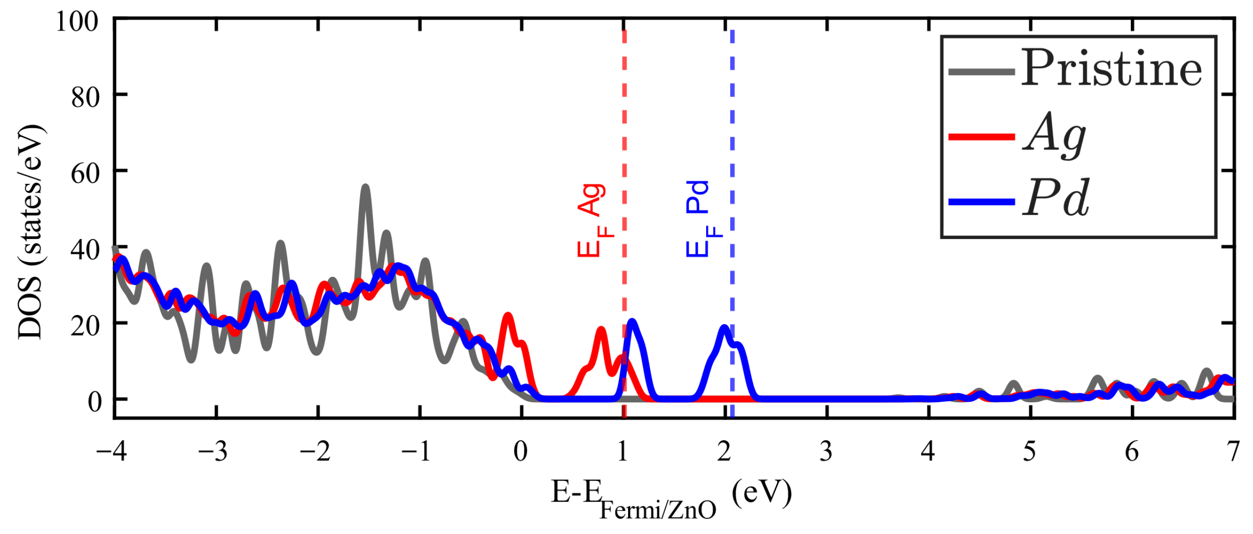 Figure 4. Density of states (DOS) of Zn15AgO16 (red filled line) and Zn15PdO16 (blue filled line). The DOS for pristine ZnO is plotted in grey.