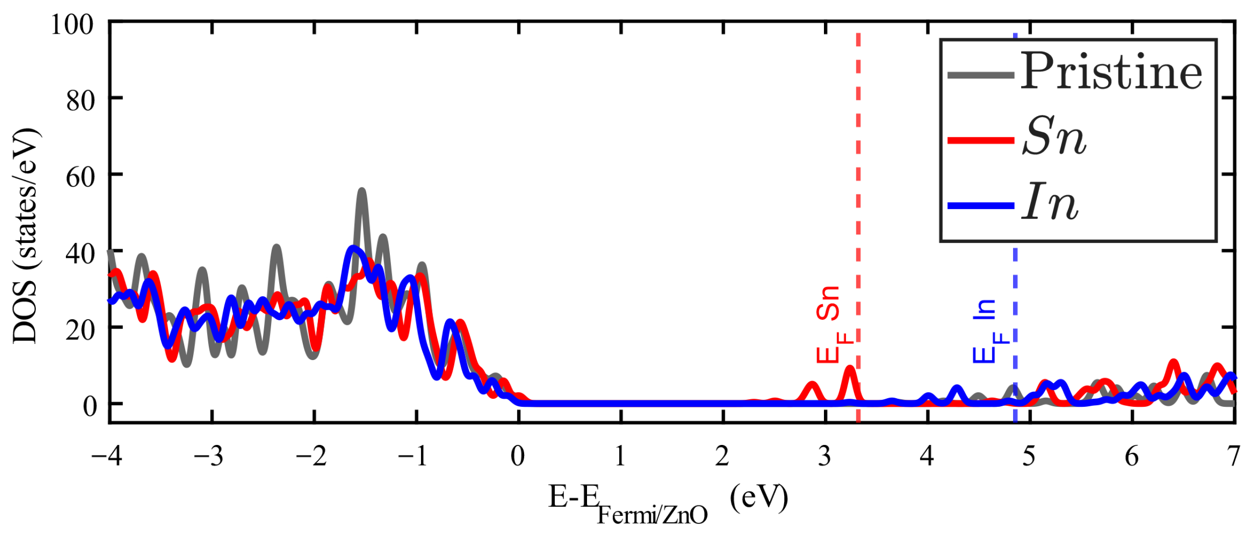 Figure 5. Density of states of Zn15InO16 (red filled line) and Zn15SnO16 (blue filled line). The DOS for pristine ZnO is plotted in grey.