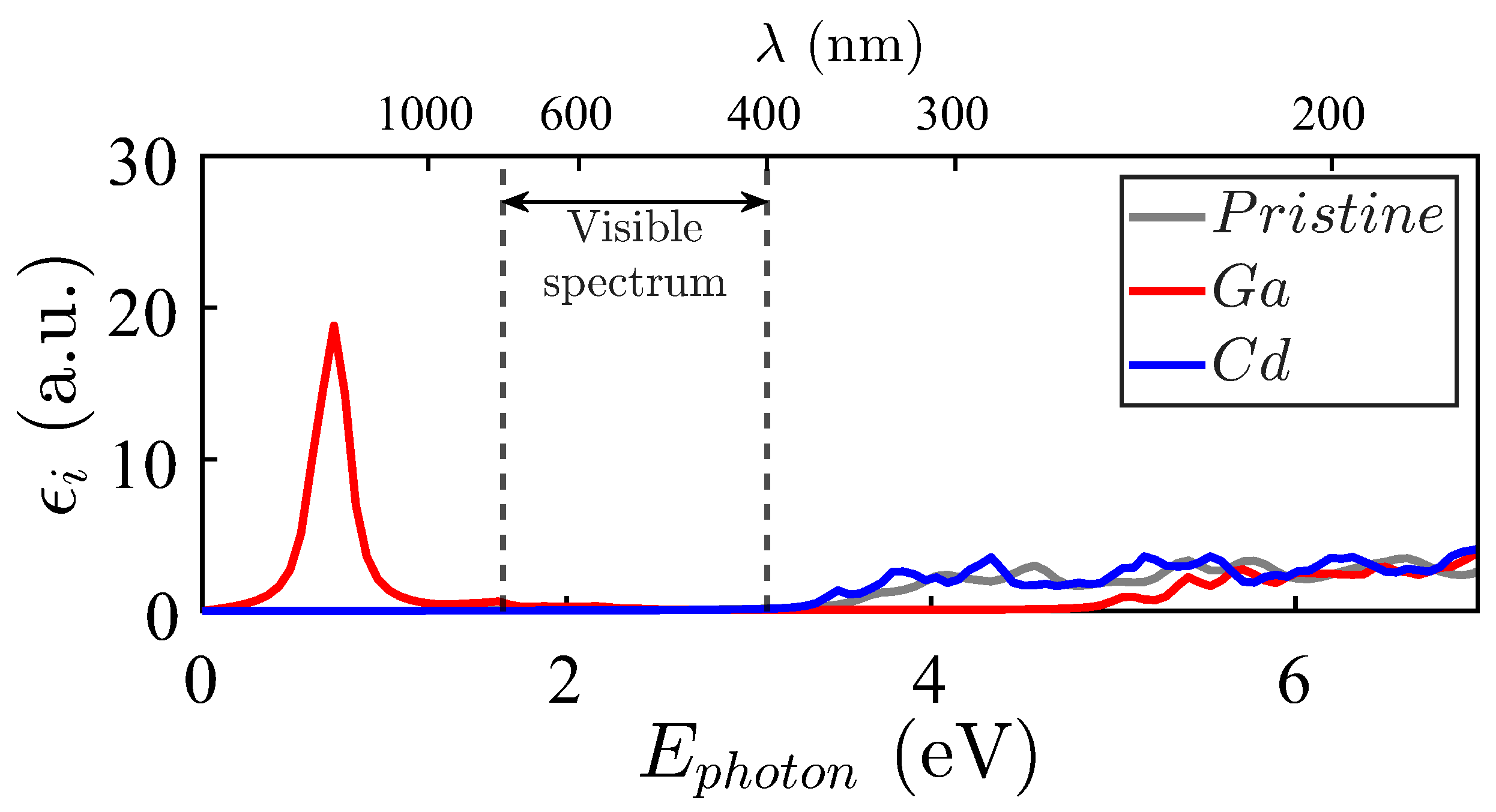 As can be appreciated, some substitutional impurities improve the electromagnetic absorption of pristine ZnO (whose ε i is depicted in grey color). Considering possible applications in photovoltaic technologies, the improvement in electromagnetic absorption induced by Pd and Ag impurities in the visible spectrum (between two vertical lines) and the near-ultraviolet transition regions is particularly interesting. No such optical absorption improvement is observed for Cd and Cu, which render an absorption spectrum quite similar to that of the pristine crystal, particularly in the visible and near-ultraviolet spectra.