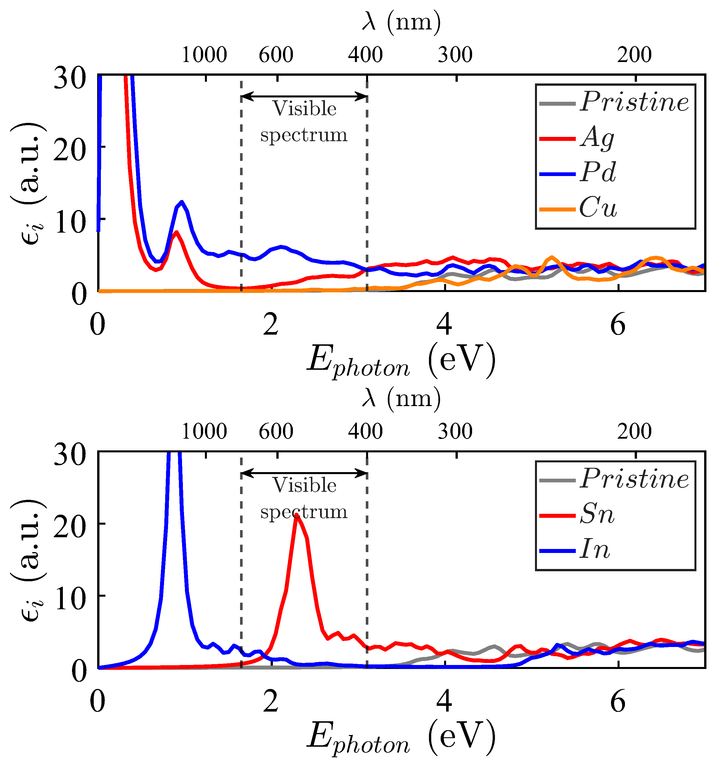 The spectra of Cu, Pd, and Ag in Figure 9, upper panel, show that Ag and, particularly, Pd impurities activate the electromagnetic absorption in the visible spectrum, as well as in the near ultraviolet. ZnO doped with Pd and Ag shows pronounced peaks at lower energies, which also occur because of the proximity of the last occupied level and the first unoccupied one (see Figure 4).