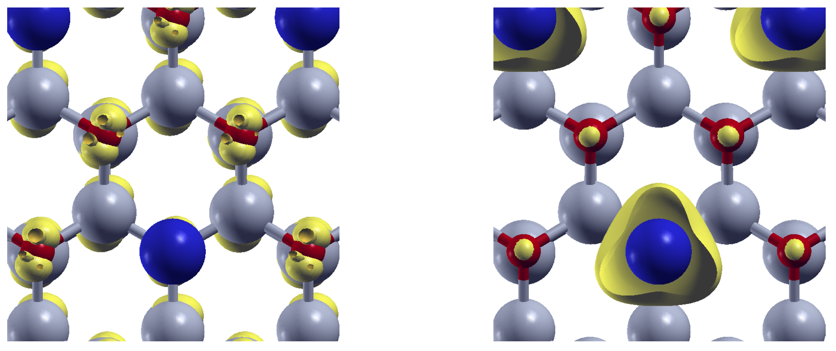 Figure 11. Orbital-resolved density (yellow) for Sn-doped ZnO at the valence band maximun (left), and at the Conduction band minimun (right). Zn (O) atoms appear depicted in gray (red). Sn atoms are depicted in blue.