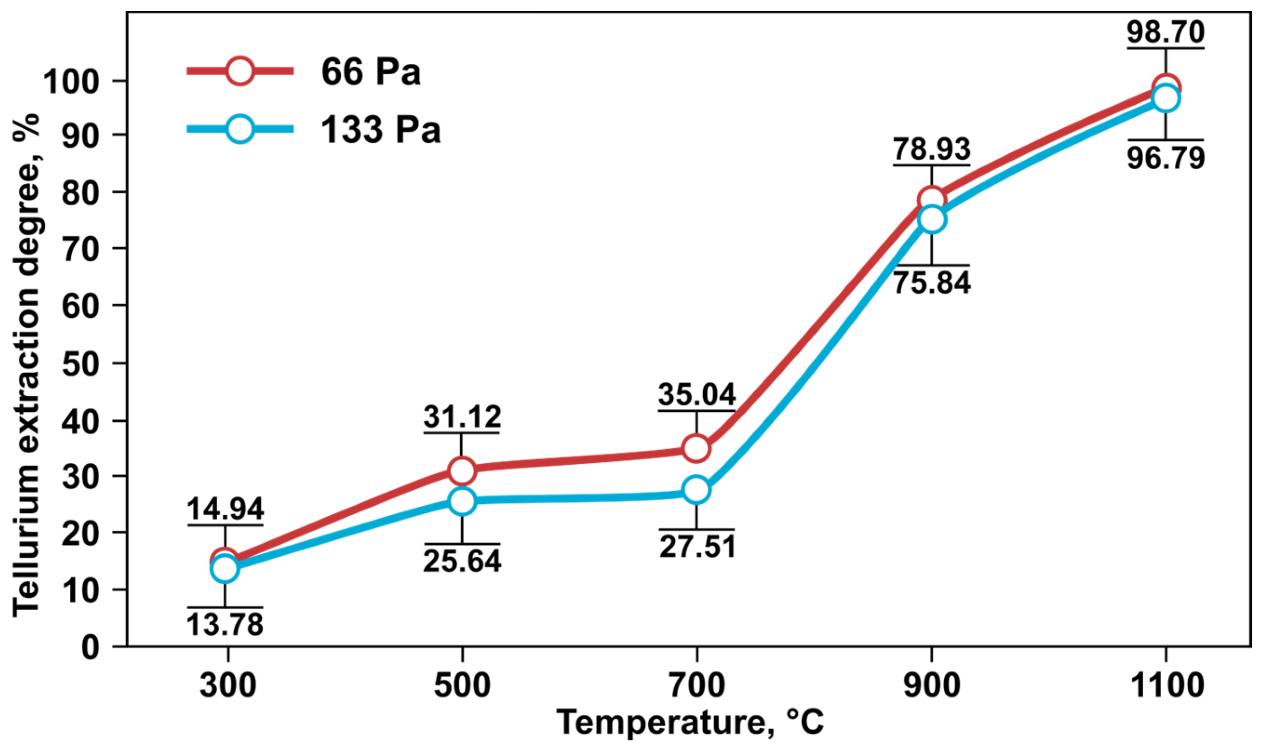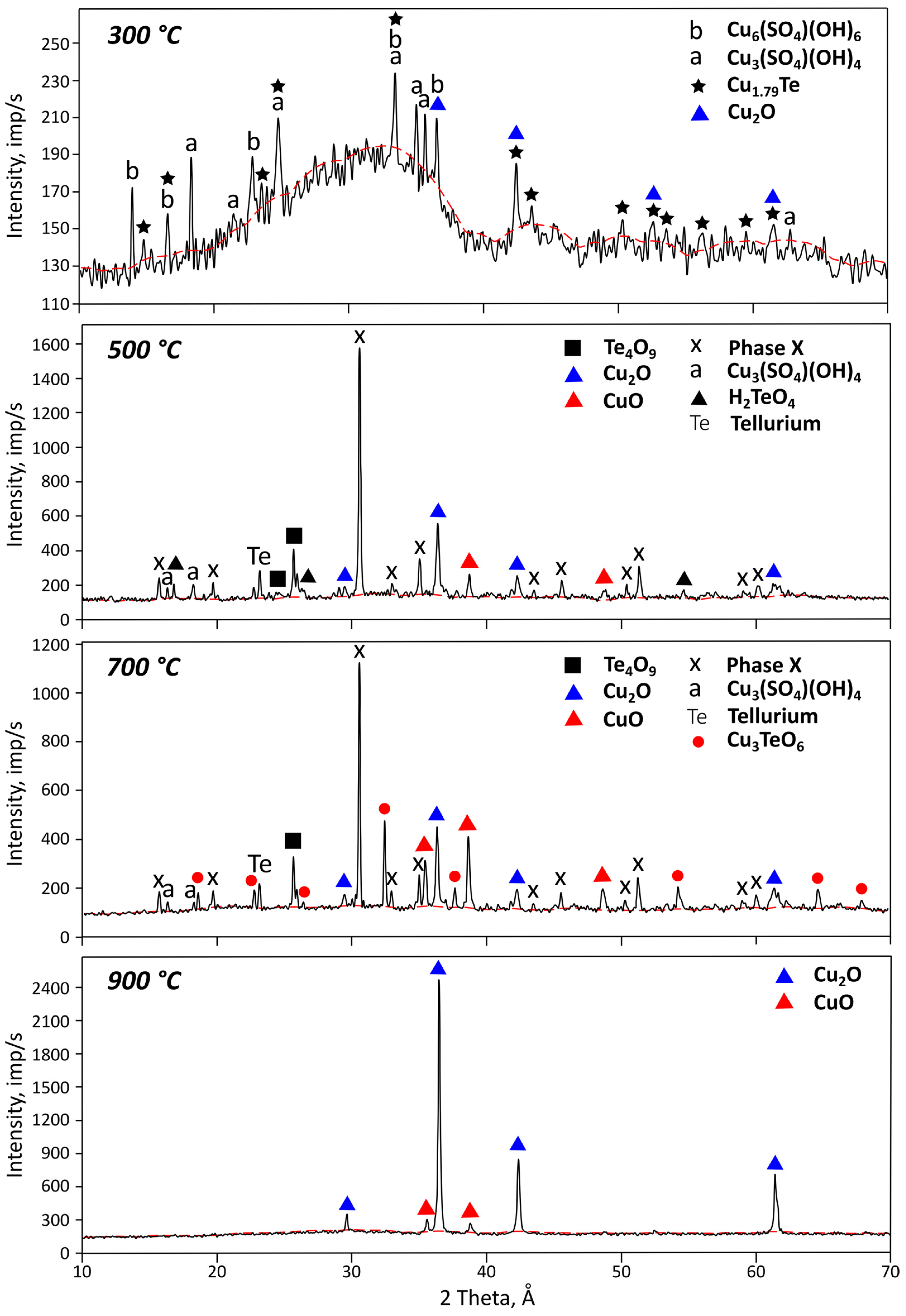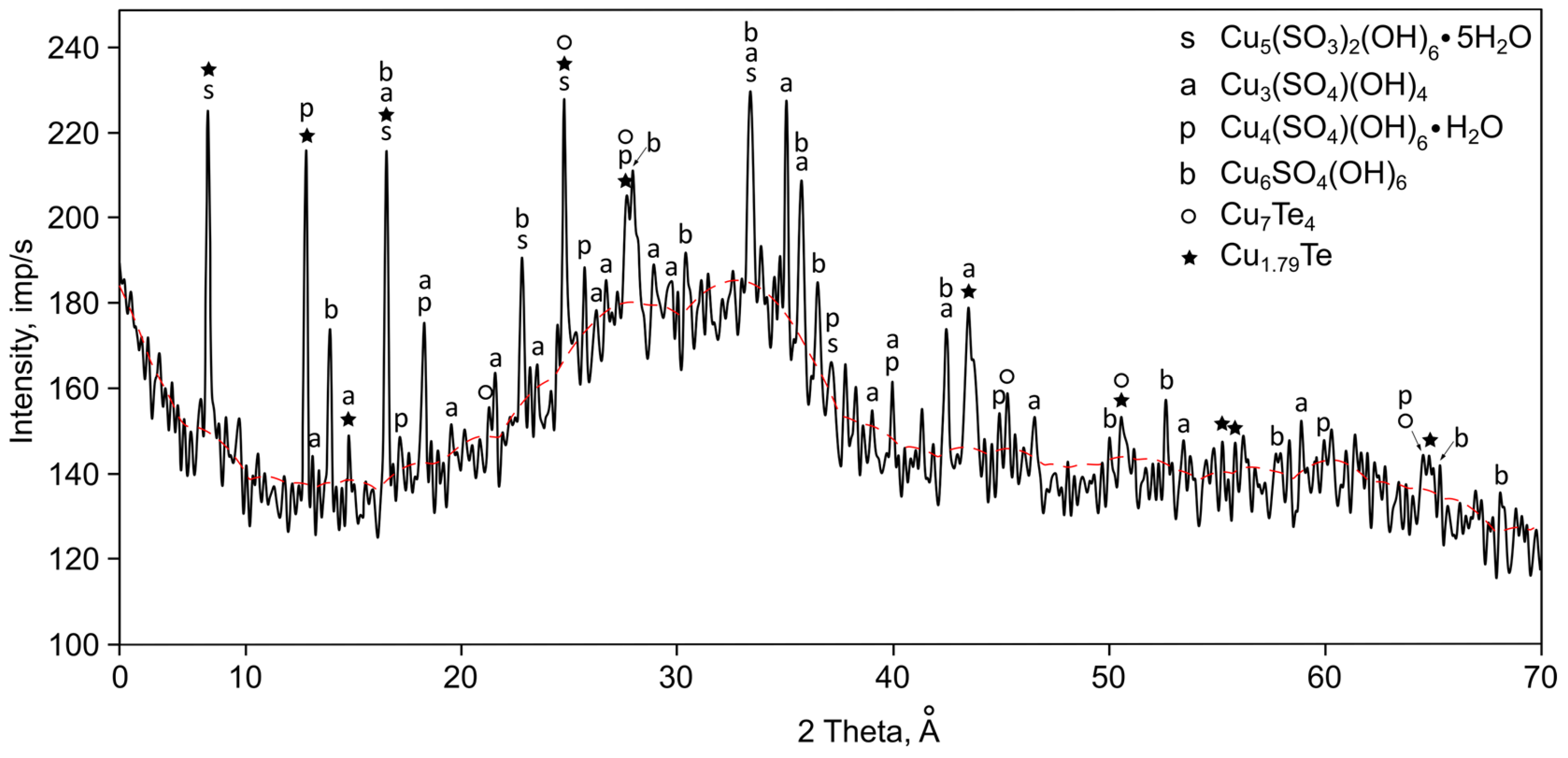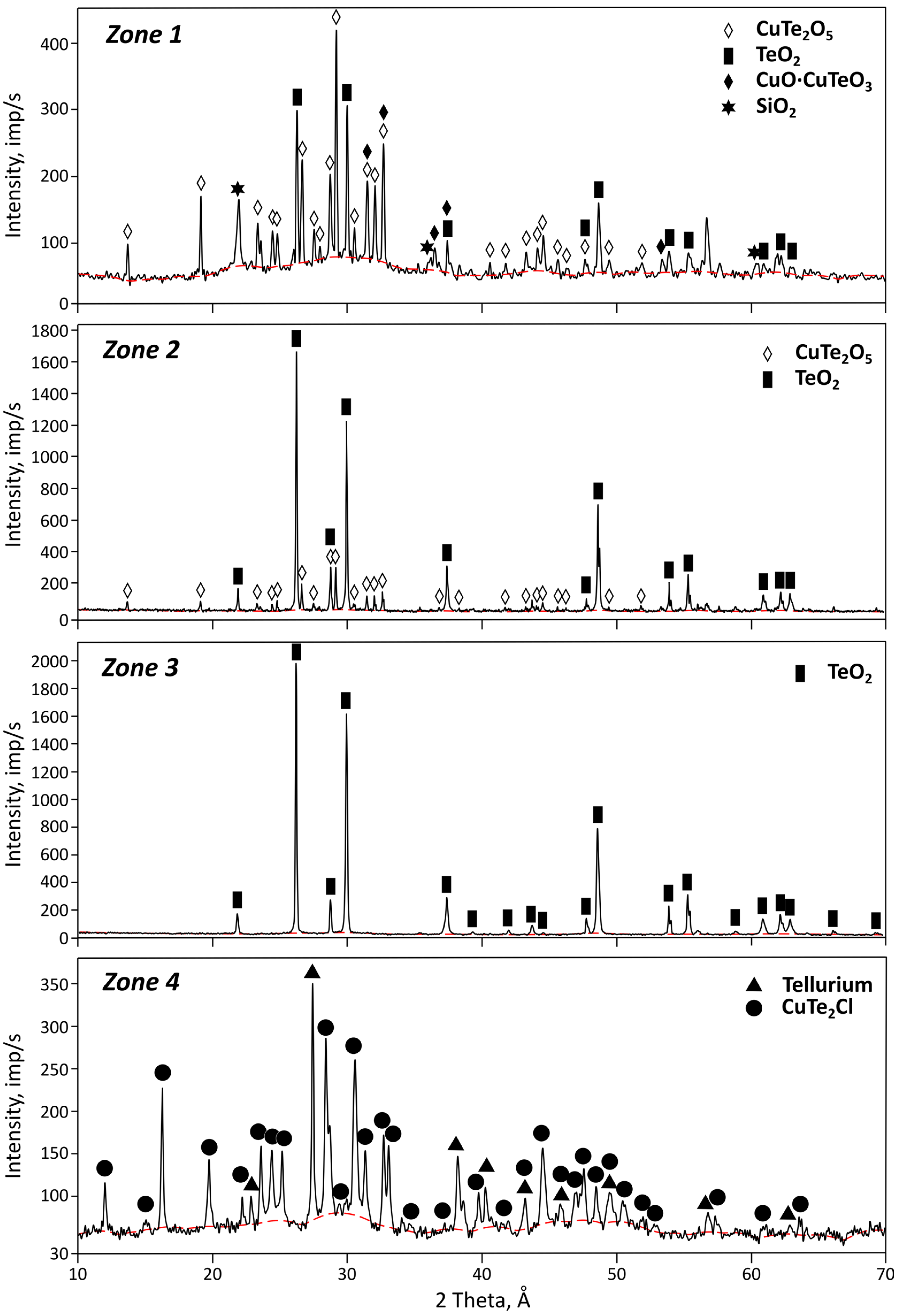 Based on the analysis, the following mechanism for the formation of tellurium-containing condensate can be hypothesized. Tellurium chloride and elemental tellurium are initially rapidly evaporated from tellurium-containing middlings. Copper or its chloride compounds are then drawn into the vapor-gas phase, and their combined condensation at low temperatures (150–100 °C) leads to formation of the chlorine-containing CuTe2Cl phase. As phase transformations occur in the tellurium-containing middlings, tellurium dioxide is released, and its rapid evaporation is accompanied by the capture of copper oxide molecules. As the vapor-gas phase passes through the first (400–350 °C) and second (350–270 °C) temperature condensation zones, they co-precipitate to form CuTe2O5 and CuO CuTeO3 in the solid phase: Te2O + CuO = CuTe2O5 and Te2O + CuO = CuO CuTeO3. In the third zone (270-150 °C), residual traces of copper are detected, and the condensate is represented by a single phase of TeO2, indicating complete precipitation of copper oxide in the higher-temperature condensation zones.