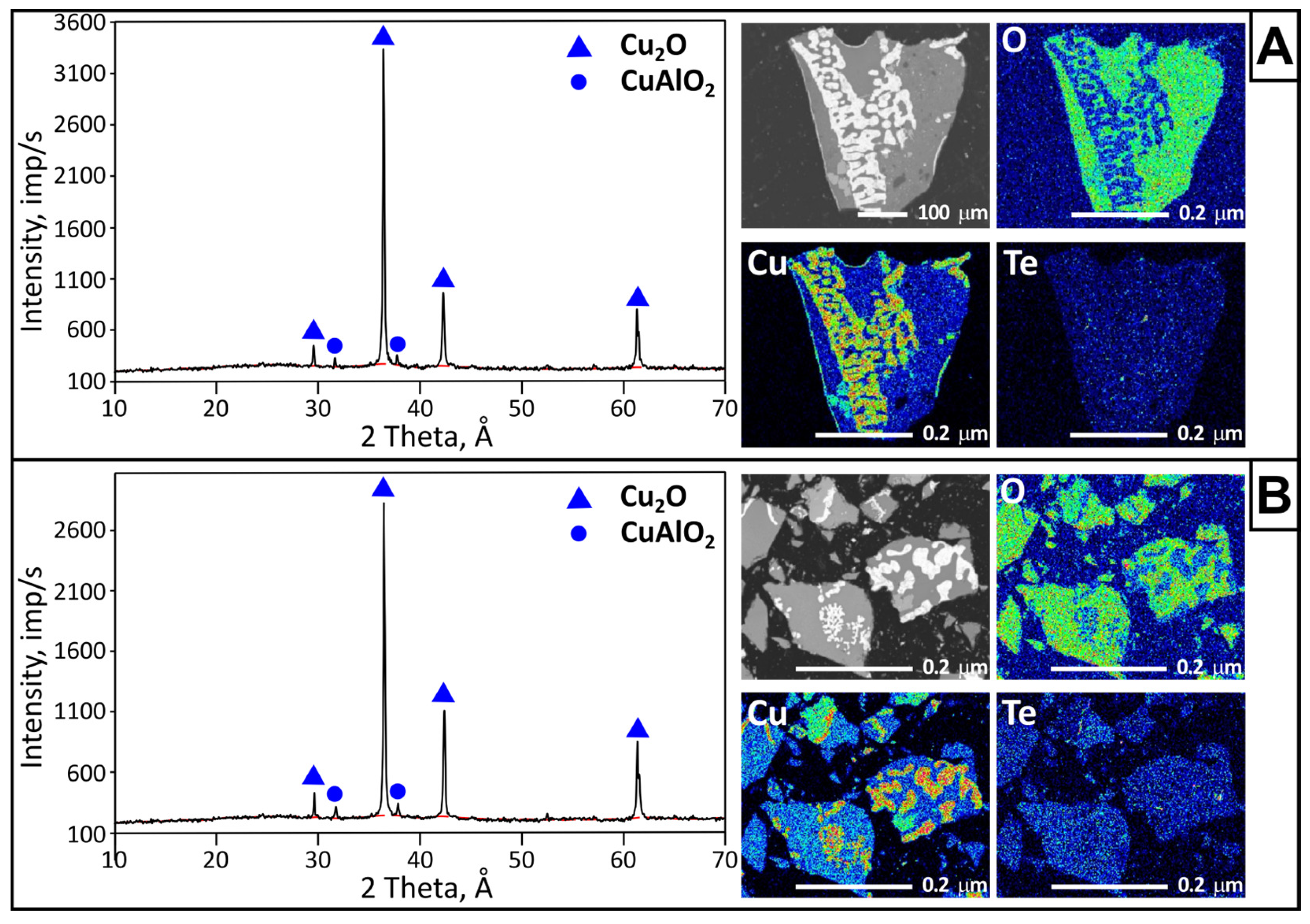 2 at lower temperatures. Thus, the presence of tellurites in the condensate can be explained by the intensive evaporation of tellurium dioxide, which mechanically entrains copper oxide molecules. Their deposition occurs together with tellurium oxide in the cold part of the reactor, where secondary formation of the discussed phases is possible.