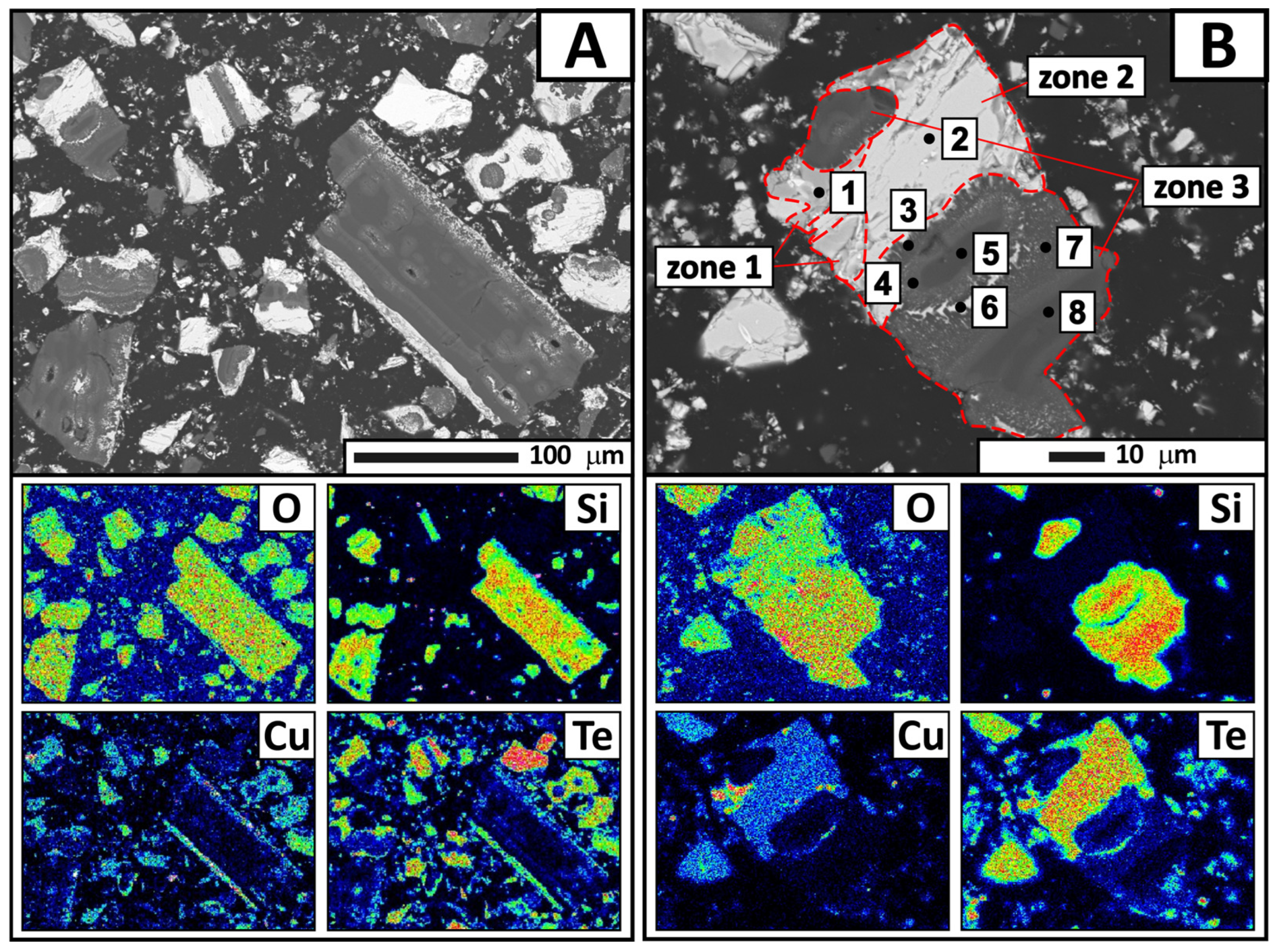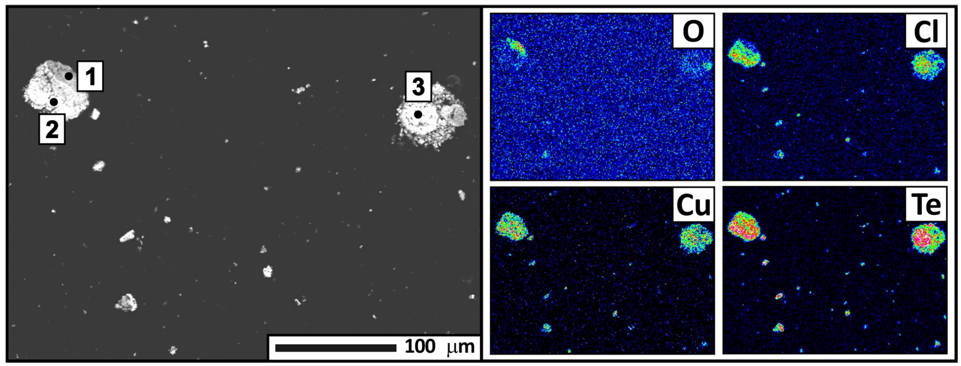 2Cl phase with a small amount of tellurium. However, elemental tellurium was not detected in subsequent SEM analysis, likely due to its low content. The main elements forming the condensate are tellurium (35.16 wt.%), copper (23.03 wt.%), oxygen (9.46 wt.%), and chlorine (7.49 wt.%). Electron probe analysis of individual condensate fragments (