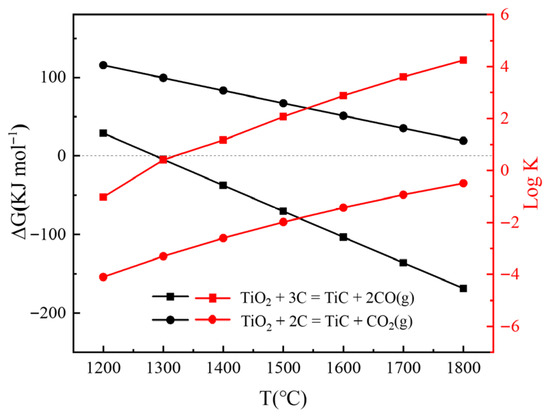 Figure 1 shows the relationship between temperature and Gibbs free energy (ΔG) and equilibrium constant (log K) of TiO2 reaction with C by HSC 6.0 software in argon atmosphere.